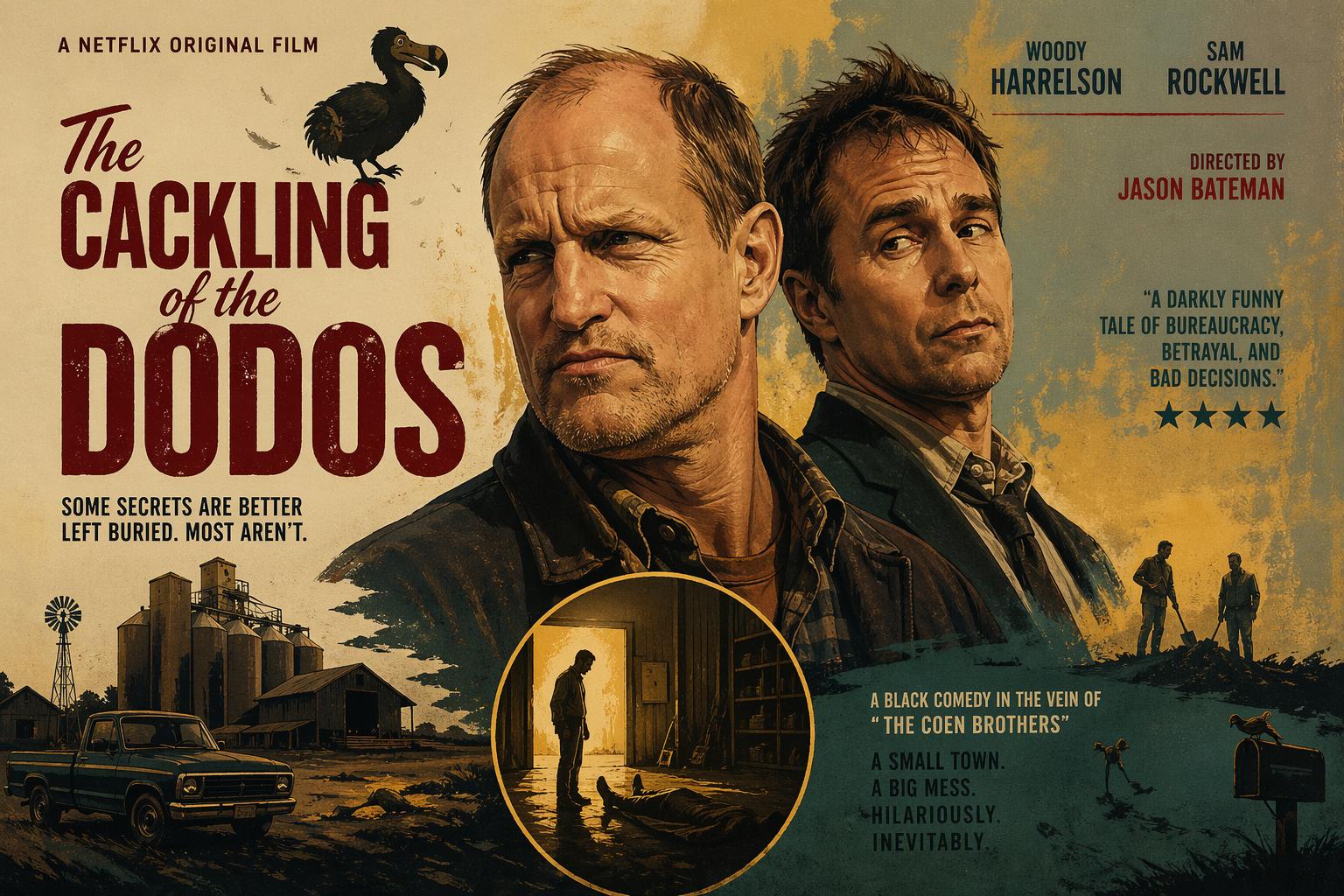 제이슨 베이트먼 감독이 연출하고 우디 해럴슨과 샘 록웰이 주연을 맡은 넷플릭스 오리지널 영화 'The Cackling of the Dodos(더 캐클링 오브 더 도도스)'가 공개 전부터 큰 관심을 모으고 있다. 시골 농부가 곡물 창고에서 시신을 발견하면서 상사에게 떠밀려 어설픈 은폐 작전에 휘말리는 이야기로, 블랙 코미디 장르 특유의 긴장감과 유머가 기대되는 작품이다.