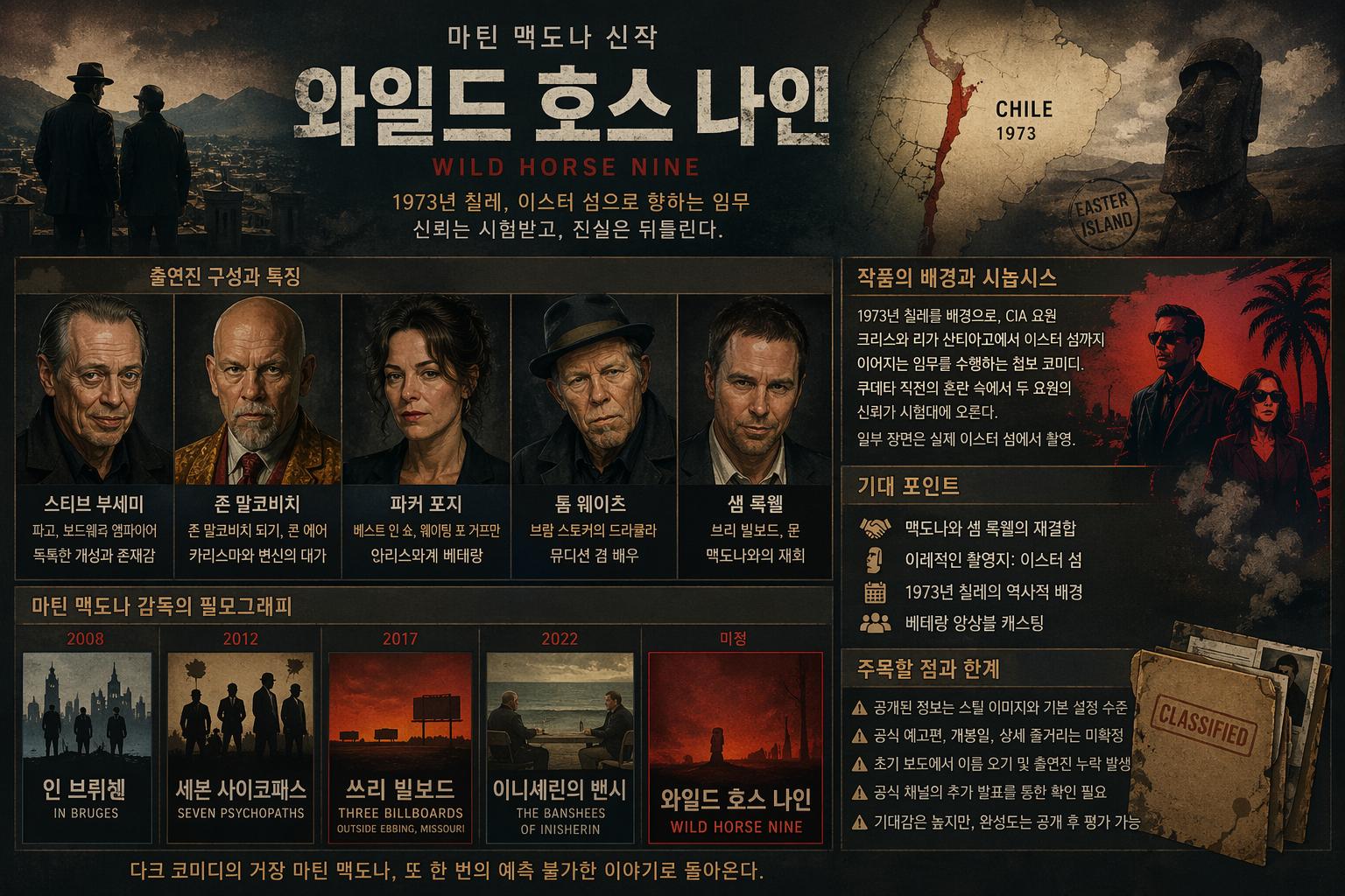 와일드 호스 나인, 마틴 맥도나 신작, 다크 코미디 영화, 샘 록웰 존 말코비치, 톰 웨이츠 배우, 1973년 칠레 영화, 이스터 섬 촬영, 이니셰린의 밴시 감독, 스티브 부세미