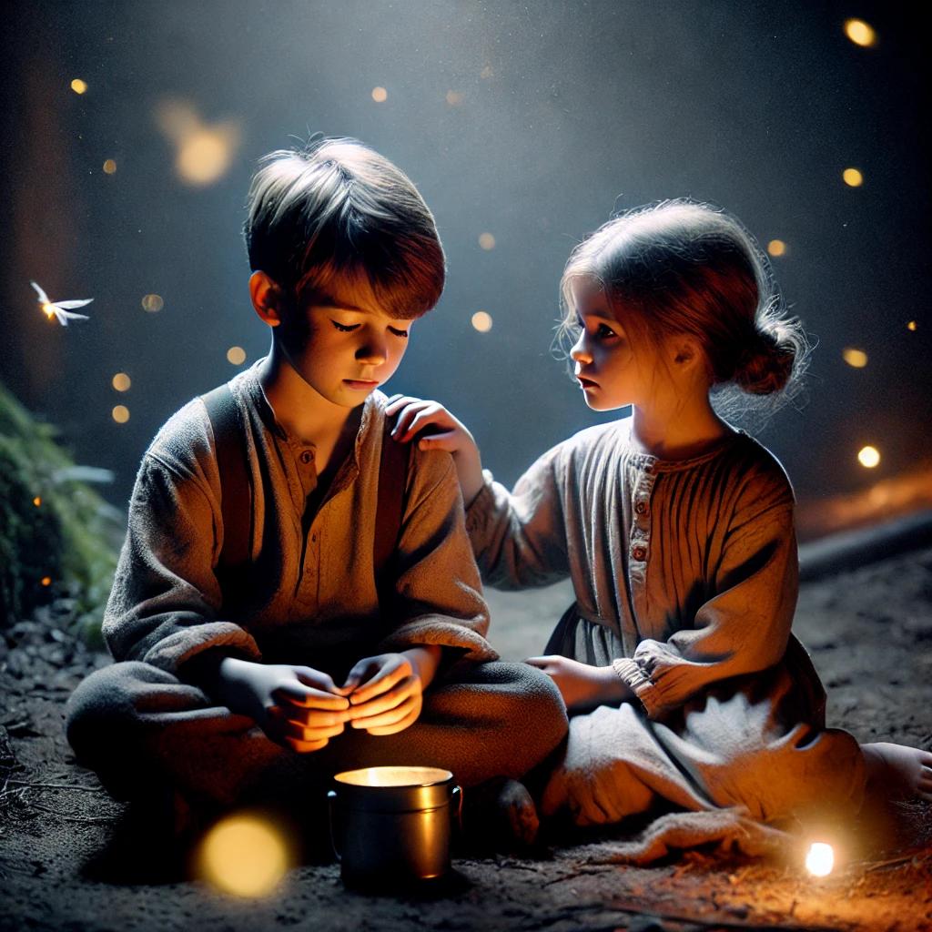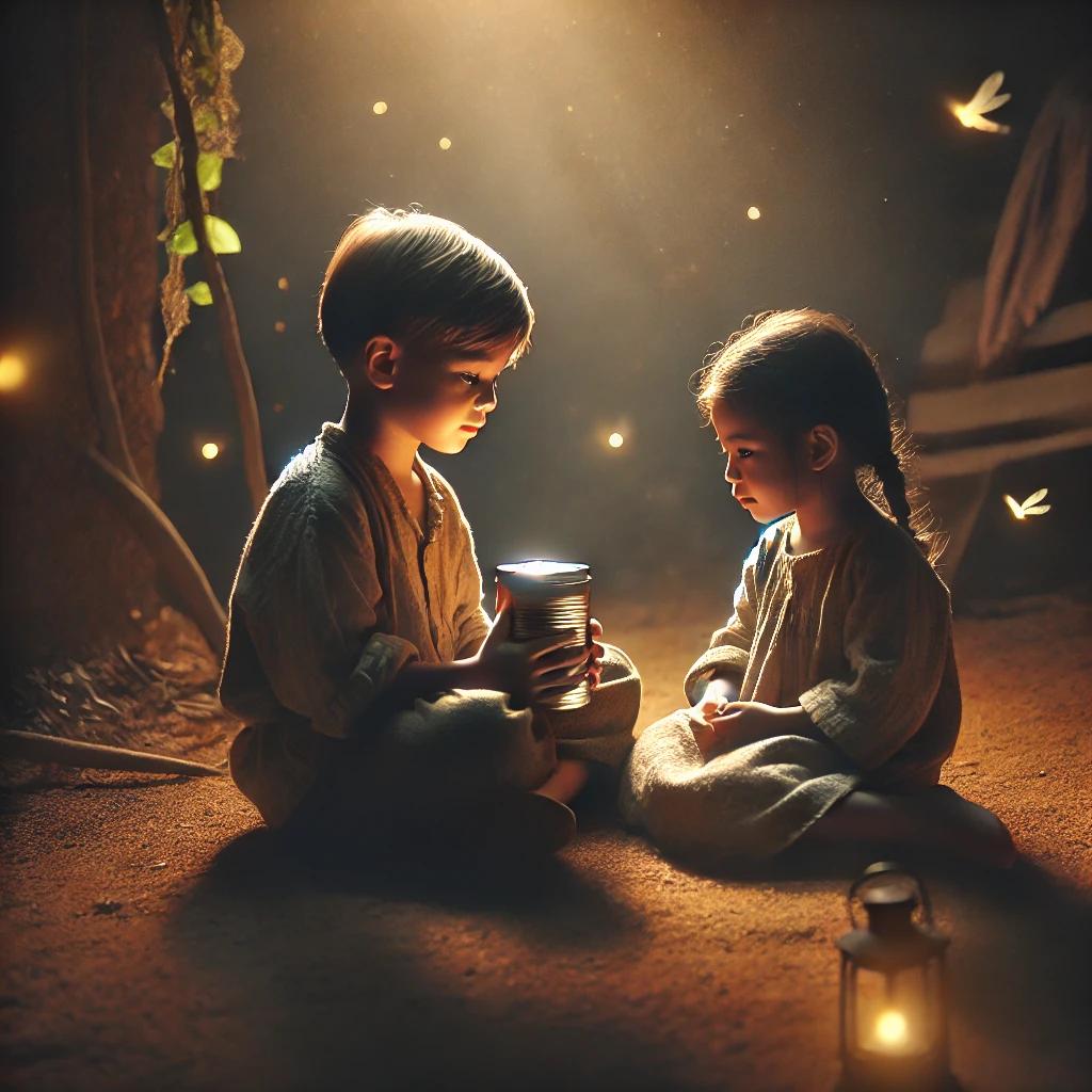 - 반딧불이를 잡아 병 속에 가둬놓는 장면 - 두 남매의 순수한 행복