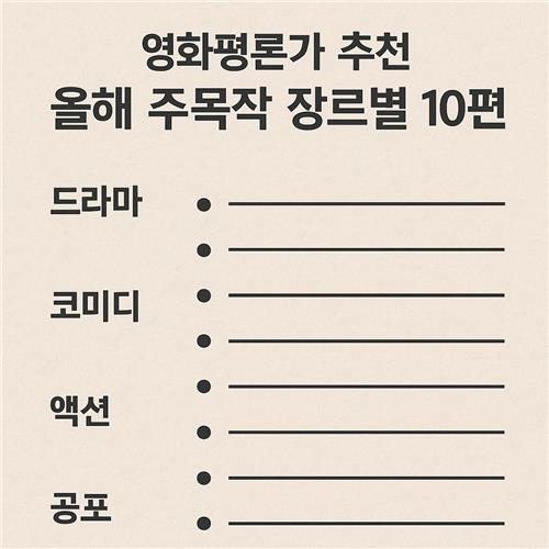 국내외 영화평론가들이 주목한, 올해 반드시 챙겨봐야 할 장르별 추천작 10편을 소개해 드릴게요. 영화 선택에 도움이 되셨다면 댓글로 의견도 남겨주세요!