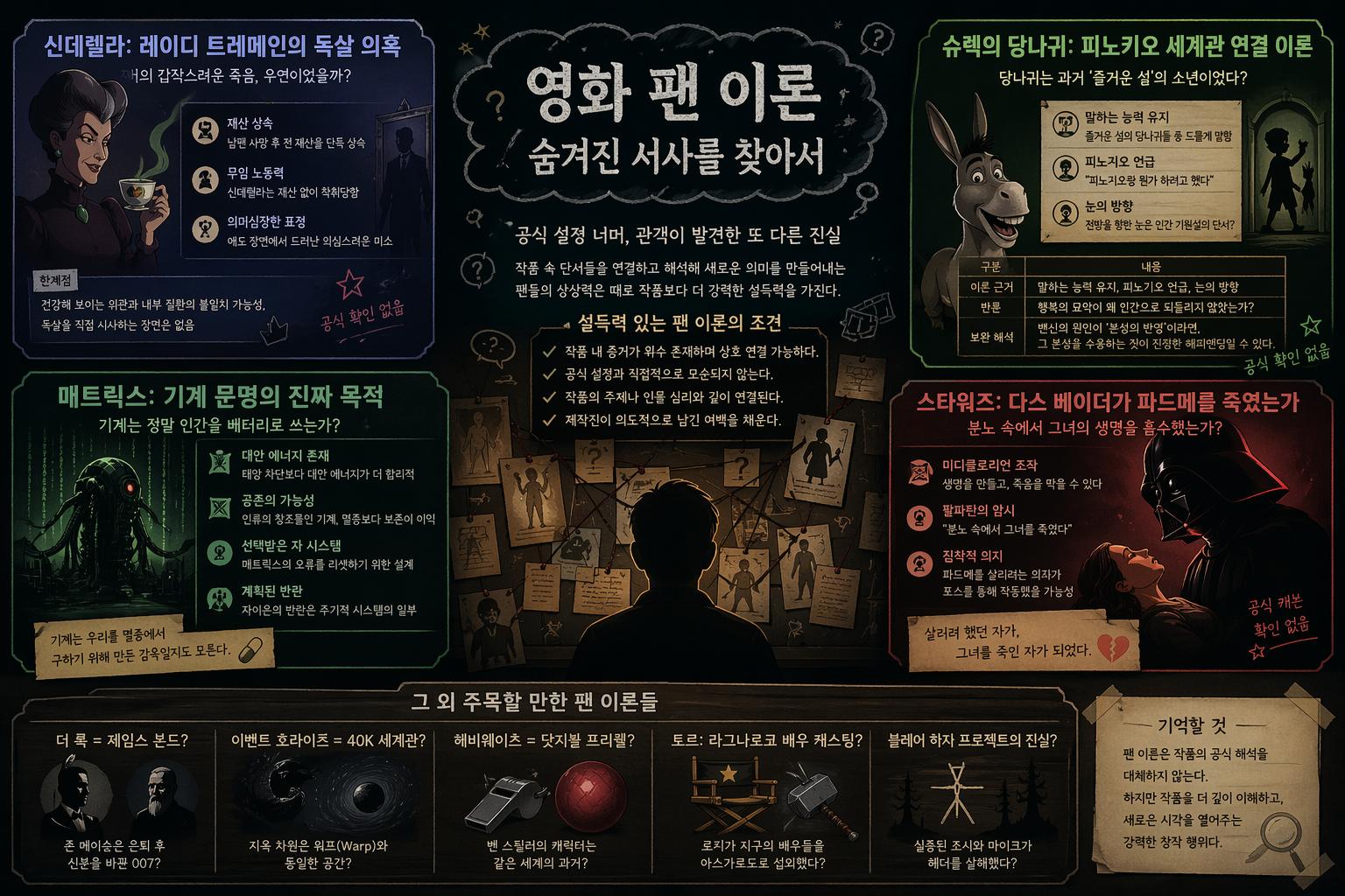 영화 팬 이론, 신데렐라 레이디 트레메인, 슈렉 당나귀 피노키오, 매트릭스 기계 목적, 다스 베이더 파드메, 팬덤 해석, 영화 떡밥, 숨겨진 서사, 디즈니 팬 이론, 스타워즈 이론