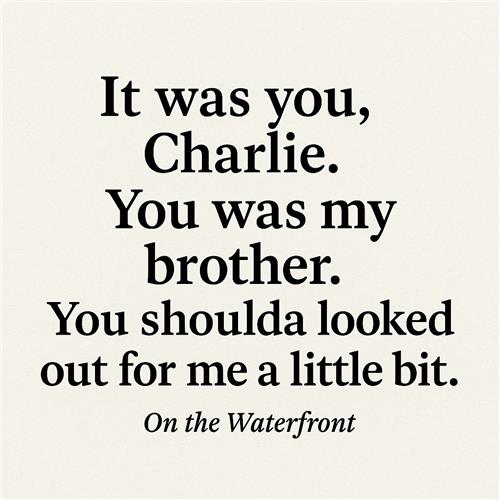 이 영화의 상징적인 장면 중 하나는 주인공 테리 말로이가 형에게 말하는 "I coulda been a contender. I coulda been somebody."라는 대사입니다. 단순한 후회의 말처럼 들릴 수 있지만, 이 대사는 억눌린 꿈, 선택받지 못한 삶의 분노, 그리고 다시 시작할 용기를 담고 있습니다.