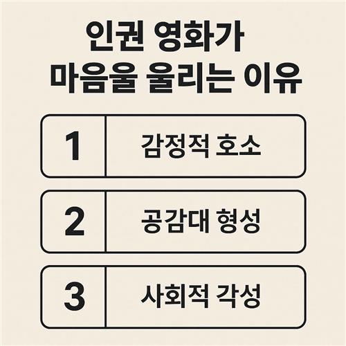 우리는 영화를 통해 타인의 세계를 잠시 빌려봅니다. 인권 영화는 그 여정이 특히 진지합니다. 원인의 이해로 시작해 공감의 서사를 통과하고 체험의 연출로 깊어지는 3단계는, 보는 일을 넘어서 살아가는 방식을 바꾸는 작은 기회가 됩니다. 오늘의 감동이 내일의 실천으로 이어지도록, 당신만의 기록과 대화를 계속 이어가 보세요. 그리고 마음에 닿은 장면과 이유를 댓글로 남겨 주시면, 다른 독자들의 관람에도 좋은 길잡이가 될 것입니다.