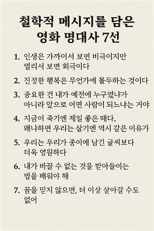 영화의 한 문장은 때로 긴 에세이보다 깊은 울림을 남깁니다. 짧지만 단단한 문장 속에는 삶과 선택, 자유와 책임, 사랑과 죽음 같은 묵직한 질문들이 숨어 있지요. 이 글에서는 그런 질문을 정면으로 마주하게 하는 명대사 7개를 골라 맥락과 철학적 의미를 함께 풀어봅니다. 스포일러는 최소화하고, 일상에서 곧장 써먹을 수 있는 사유의 힌트를 더했습니다. 읽으며 당신만의 해석을 곁가지처럼 덧대 보세요. 그리고 마지막에는 오늘의 생각을 한 줄로 정리해 댓글로 나눠요.