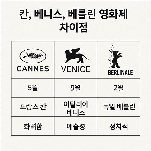 칸영화제, 베니스영화제, 베를린영화제, 세계3대영화제, 영화제비교, 황금종려상, 황금사자상, 황금곰상, 영화상식, 유럽영화제